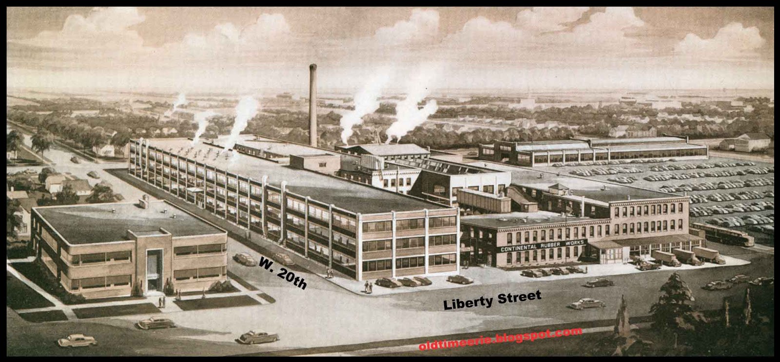 "Mr. Palmer had found an ideal plant location at 19th and Liberty Streets. The new plant, formerly occupied by the Tribune Bicycle Works, consisted of four large brick and stone buildings with a floor space of approximately 115,000 square feet...Within four years, all the original buildings were occupied by new machinery and other production facilities to meet the ever-growing demand for Continental tires, tubes, hose and other rubber products...